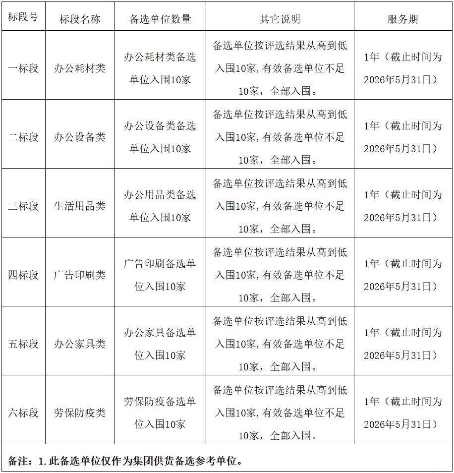 2、本次招標(biāo)項(xiàng)目共分為六個(gè)標(biāo)段,標(biāo)段名稱及備選數(shù)量如下: