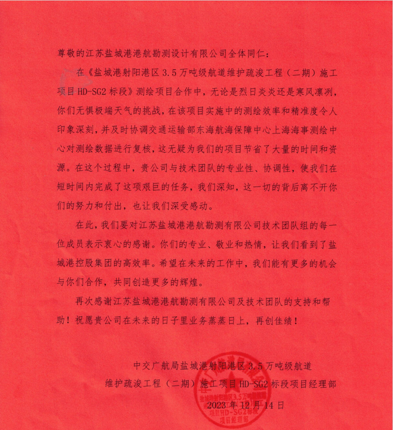 近日,鹽城港港航勘測設(shè)計公司收到來自中交廣航局鹽城射陽港區(qū)項目經(jīng)理部的感謝信,感謝港航勘測設(shè)計公司及技術(shù)團隊的支持和幫助。