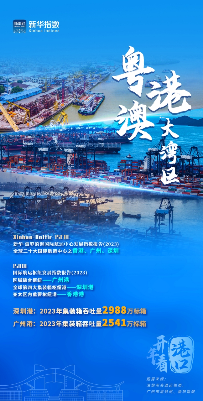 從2022年起,廣州港、深圳港、珠海港、東莞港4個港口就成功晉級億噸大港行列。在中國經(jīng)濟(jì)信息社聯(lián)合波羅的海交易所發(fā)布的《新華·波羅的海國際航運(yùn)中心發(fā)展指數(shù)報告(2023)》中,香港、廣州、深圳躋身全球二十大國際航運(yùn)中心之列。在《國際航運(yùn)樞紐發(fā)展指數(shù)報告(2023)》中,深圳港被評為全球第四大集裝箱樞紐港;香港港被評為亞太區(qū)內(nèi)重要樞紐港;廣州港被評為區(qū)域綜合樞紐港。