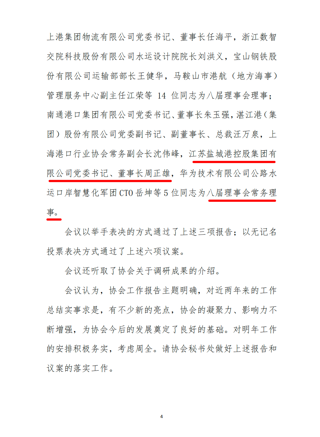 近日,中國(guó)港口協(xié)會(huì)八屆六次理事會(huì)暨八屆十次常務(wù)理事會(huì)會(huì)議成功舉行。經(jīng)選舉,集團(tuán)黨委書(shū)記、董事長(zhǎng)周正雄當(dāng)選八屆理事會(huì)常務(wù)理事。