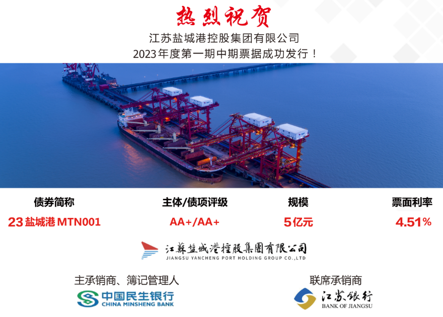 當前,集團正按照“十四五”發(fā)展規(guī)劃,圍繞主責主業(yè),持續(xù)加大航道以及港口碼頭配套設(shè)施方面投資,進一步提升港口能級與服務質(zhì)量。本期中期票據(jù)作為債券市場的公開產(chǎn)品,成功發(fā)行有利于更好地引導各融資產(chǎn)品的價格區(qū)間,進一步鞏固集團在金融市場的口碑。未來,鹽城港集團將持續(xù)在資本市場探索多元化的直接融資工具,為集團高質(zhì)量發(fā)展提供強有力的資金保障。