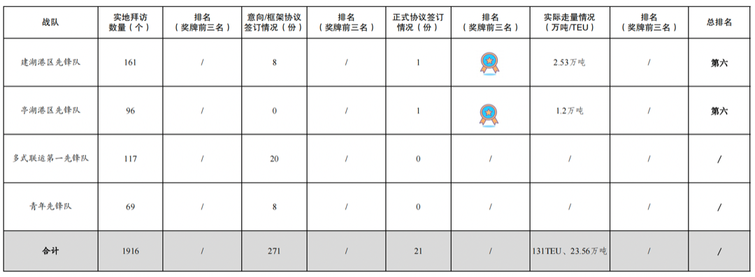 4.實際走量131TEU、23.56萬噸:其中黨員先鋒隊4.85萬噸,射陽港區(qū)先鋒隊4.32萬噸,響水港區(qū)先鋒隊3.84萬噸,航運集團(tuán)先鋒隊2.79萬噸、86TEU,建湖港區(qū)先鋒隊2.53萬噸,阜寧港區(qū)先鋒隊1.8萬噸,大豐港區(qū)先鋒隊1.21萬噸,亭湖港區(qū)先鋒隊1.2萬噸,濱海港區(qū)先鋒隊1.02萬噸,巾幗先鋒隊45TEU。
