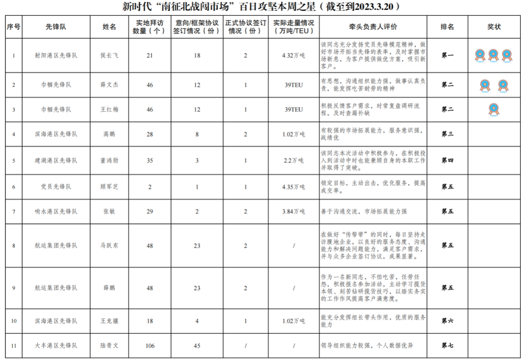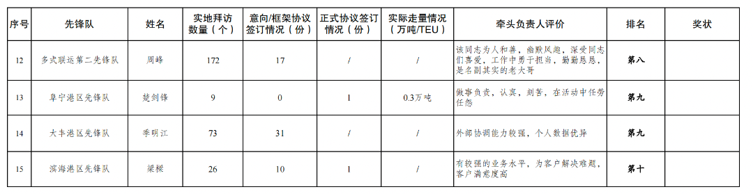 第一名:航運集團(tuán)先鋒隊 馬躍東,射陽港區(qū)先鋒隊 侯長飛,濱海港區(qū)先鋒隊 高鵬,響水港區(qū)先鋒隊 張敏 2份