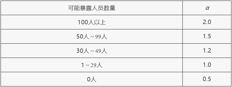 根據(jù)重大危險源所在港口企業(yè)作業(yè)區(qū)邊界向外擴(kuò)展500米范圍內(nèi)常住人口數(shù)量,設(shè)定暴露人員校正系數(shù)(α)值,見表3。