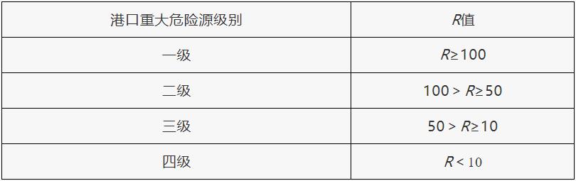 第五條 港口經(jīng)營人應(yīng)當(dāng)對本單位的港口重大危險源進(jìn)行安全評估,并確定重大危險源等級。港口重大危險源按照其危險程度,由高到低依次劃分為一級、二級、三級、四級。港口重大危險源分級方法見附件。