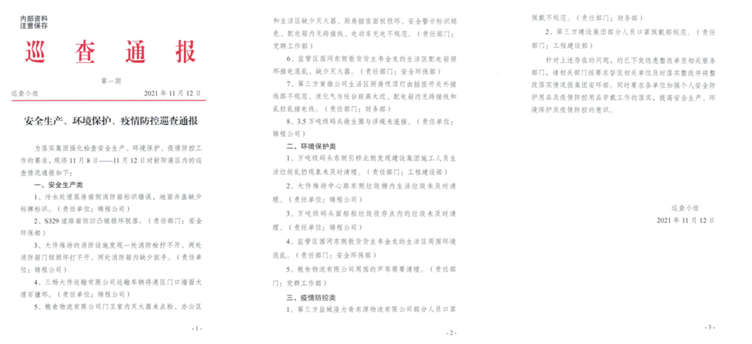 安全巡查員每日對(duì)港區(qū)內(nèi)安全生產(chǎn)、環(huán)境保護(hù)、疫情防控工作進(jìn)行檢查,對(duì)進(jìn)港人員信息登記、作業(yè)人員勞動(dòng)防護(hù)用品穿戴、作業(yè)現(xiàn)場(chǎng)安全管理等情況逐一細(xì)致排查,確保不放過(guò)一個(gè)死角,不留下一個(gè)隱患。對(duì)巡查中發(fā)現(xiàn)的問(wèn)題隱患,及時(shí)下發(fā)整改通知單,要求相關(guān)責(zé)任單位、部門(mén)限期整改,并對(duì)照整改時(shí)限進(jìn)行復(fù)查,確保隱患整改到位。