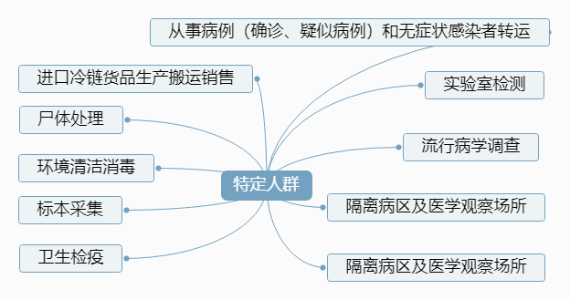 6.“特定人群”:在新冠肺炎疫情期間,從事病例(確診、疑似病例)和無癥狀感染者轉(zhuǎn)運(yùn)、尸體處理、環(huán)境清潔消毒、標(biāo)本采集、實(shí)驗(yàn)室檢測(cè)、流行病學(xué)調(diào)查、隔離病區(qū)及醫(yī)學(xué)觀察場(chǎng)所、衛(wèi)生檢疫、進(jìn)口冷鏈貨品生產(chǎn)搬運(yùn)銷售等工作的人群。