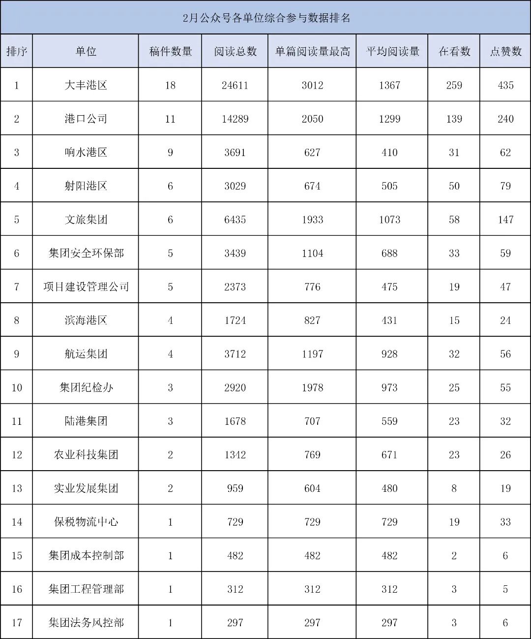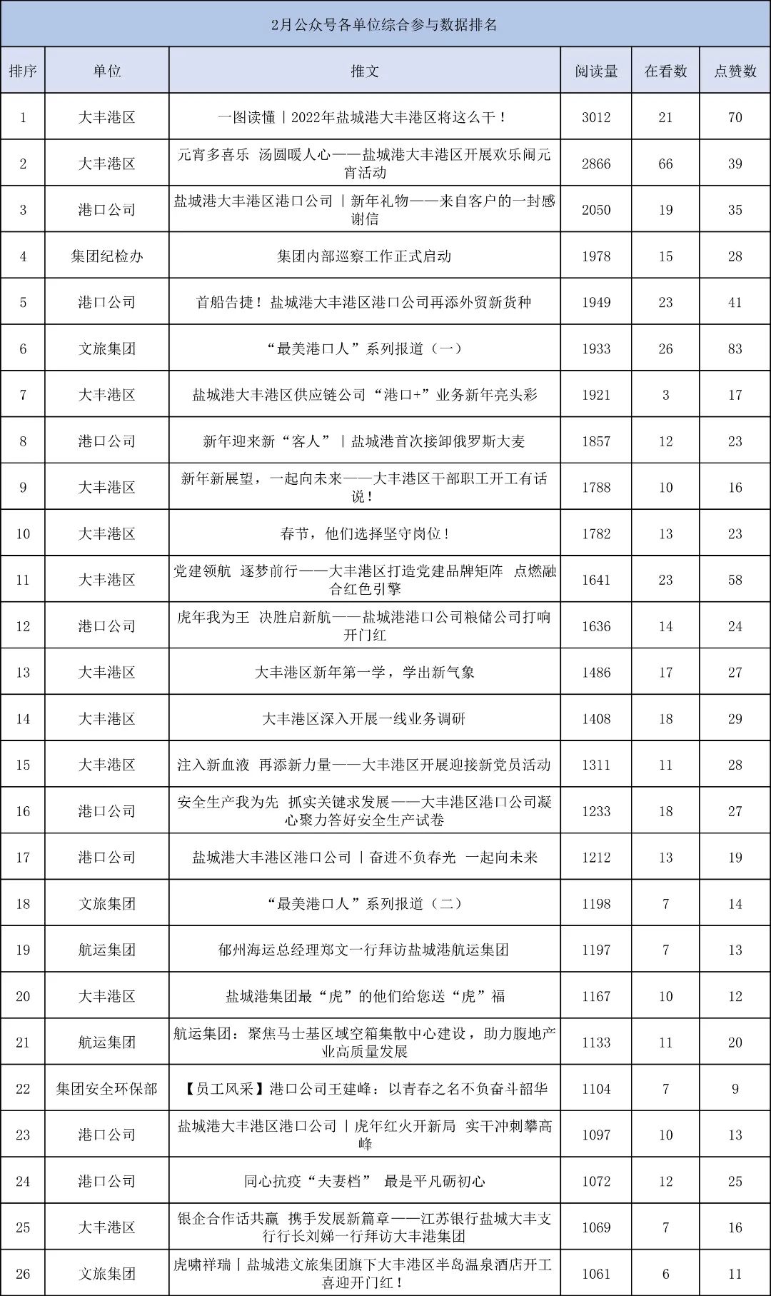 2月榜單,鹽城港集團(tuán)公眾號(hào)“前浪”表現(xiàn)可圈可點(diǎn),“后浪”蓄勢(shì)待發(fā)。這個(gè)2月,是誰(shuí)遙遙領(lǐng)先?誰(shuí)又在奮起直追?請(qǐng)看2月榜單!