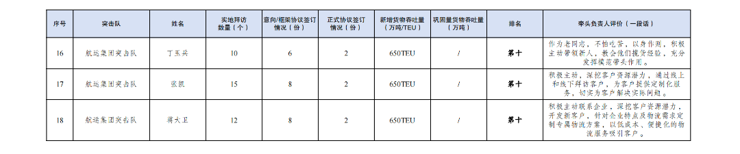 第一名:巾幗突擊隊 李婷婷(拜訪客戶187家,簽訂意向協(xié)議45份,簽訂正式協(xié)議5份,新增貨物吞吐量48TEU,鞏固量貨物吞吐量68TEU)