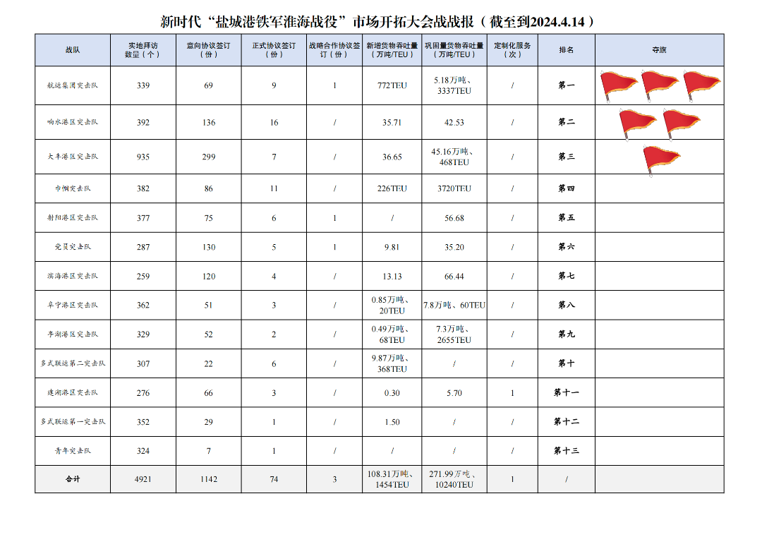 1.累計(jì)拜訪客戶數(shù)量4921家:其中大豐港區(qū)突擊隊(duì)935家,響水港區(qū)突擊隊(duì)392家,巾幗突擊隊(duì)382家,射陽(yáng)港區(qū)突擊隊(duì)377家,阜寧港區(qū)突擊隊(duì)362家,多式聯(lián)運(yùn)第一突擊隊(duì)352家,航運(yùn)集團(tuán)突擊隊(duì)339家,亭湖港區(qū)突擊隊(duì)329家,青年突擊隊(duì)324家,多式聯(lián)運(yùn)第二突擊隊(duì)307家,黨員突擊隊(duì)287家,建湖港區(qū)突擊隊(duì)276家,濱海港區(qū)突擊隊(duì)259家。
