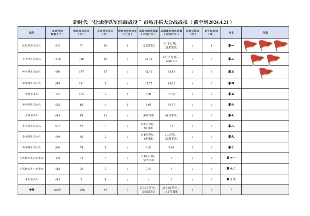 第一名:大豐港區(qū)突擊隊(duì) 夏迎冬(拜訪客戶182家,簽訂意向協(xié)議122份,簽訂正式協(xié)議7份,新增貨物吞吐量11.49萬噸,鞏固量貨物吞吐量45.16萬噸)