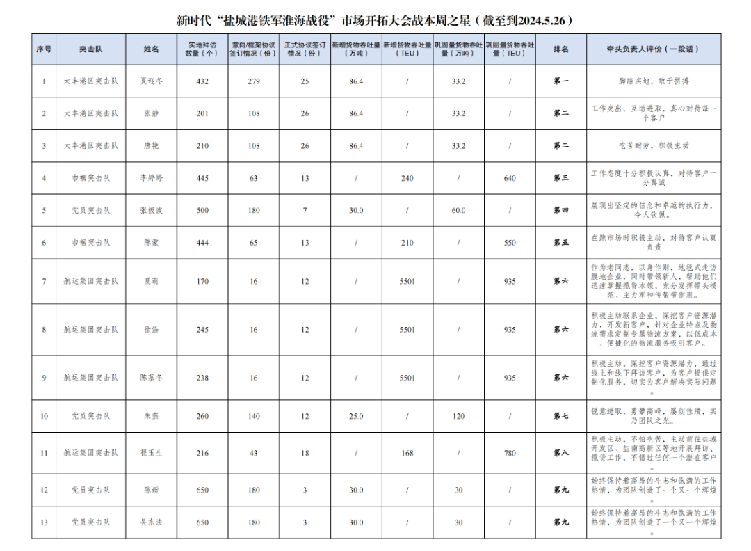 第一名:大豐港區(qū)突擊隊(duì) 夏迎冬(拜訪客戶432家,簽訂意向協(xié)議279份,簽訂正式協(xié)議25份,新增貨物吞吐量86.4萬(wàn)噸,鞏固量貨物吞吐量33.2萬(wàn)噸);