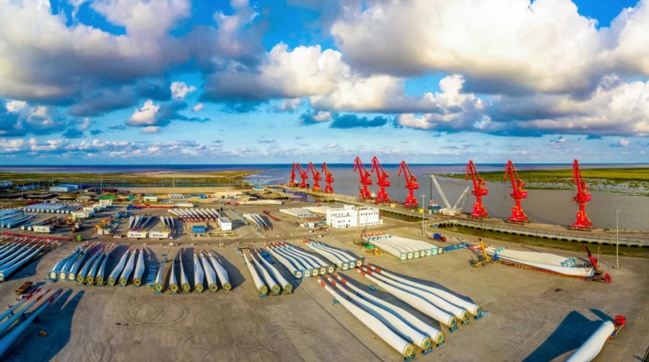 風(fēng)能是一種清潔可再生能源,風(fēng)力發(fā)電近年來越發(fā)受到世界各國重視。鹽城港作為華東地區(qū)大型國產(chǎn)風(fēng)電葉片的主要出口港之一,風(fēng)電葉片主要出口到共建“一帶一路”國家。此次共起運20套60件風(fēng)電葉片及其附屬配件,其中葉片長75.8米,貨物總體積超6萬余立方米,總價值約6000萬元,是中國專門為國際市場(印度)需求研發(fā)的陸上風(fēng)電設(shè)備。據(jù)鹽城出入境邊防檢查站統(tǒng)計,2024年鹽城港射陽港區(qū)累計完成風(fēng)電裝備裝卸量936.85萬噸,同比增長23.67%,外貿(mào)風(fēng)電完成19.01萬噸,同比增長100%。