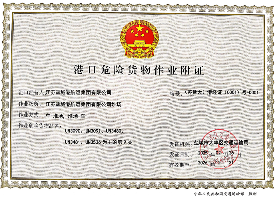 2月26日,鹽城港園林式危貨堆場(chǎng)獲批“港口經(jīng)營(yíng)許可證”“港口危險(xiǎn)貨物作業(yè)附證”雙證,標(biāo)志著鹽城地區(qū)首家且唯一的集裝箱危險(xiǎn)貨物堆場(chǎng)即將正式投入運(yùn)營(yíng),將為全市“新三樣”產(chǎn)業(yè)提供一條最為便捷的運(yùn)輸通道。