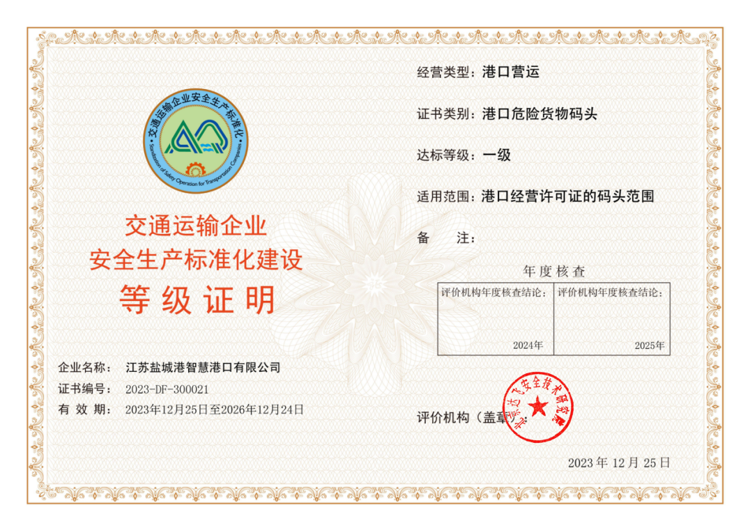 近日,江蘇鹽城港智慧港口公司順利通過交通運(yùn)輸企業(yè)安全生產(chǎn)標(biāo)準(zhǔn)化達(dá)標(biāo)認(rèn)證考核,喜獲“交通運(yùn)輸企業(yè)安全生產(chǎn)標(biāo)準(zhǔn)化建設(shè)一級證書”,標(biāo)志著智慧港口公司安全生產(chǎn)管理體系精細(xì)化、規(guī)范化、標(biāo)準(zhǔn)化建設(shè)邁上新臺階。
