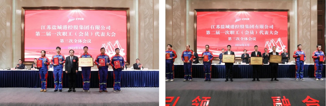 會(huì)議現(xiàn)場(chǎng)為榮獲2023年市技能競(jìng)賽先進(jìn)集體、“鹽城市五一創(chuàng)新能手”先進(jìn)個(gè)人、首屆長(zhǎng)江港口門式起重機(jī)集裝箱岸邊吊操作工職業(yè)技能競(jìng)賽團(tuán)體一等獎(jiǎng)、中華全國(guó)總工會(huì)“云宣講”達(dá)人的單位及個(gè)人頒獎(jiǎng)。