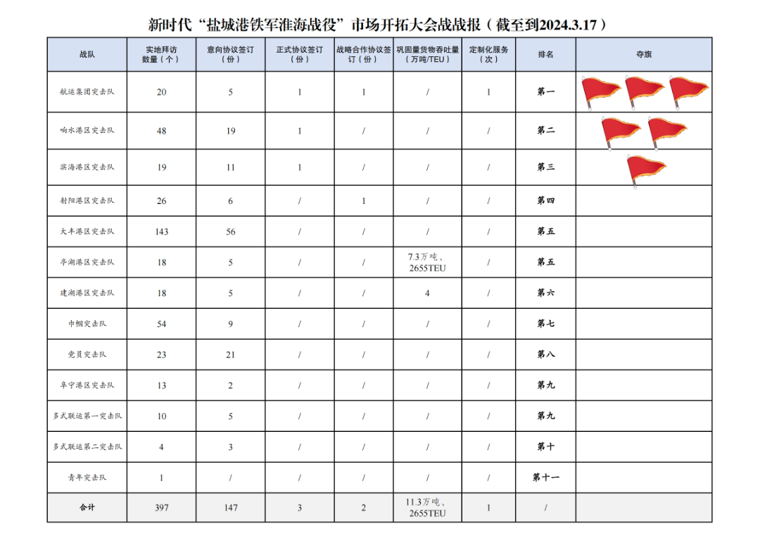 2.簽訂意向協(xié)議數(shù)量147份:其中大豐港區(qū)突擊隊(duì)56份,黨員突擊隊(duì)21份,響水港區(qū)突擊隊(duì)19份,濱海港區(qū)突擊隊(duì)11份,巾幗突擊隊(duì)9份,射陽(yáng)港區(qū)突擊隊(duì)6份,航運(yùn)集團(tuán)突擊隊(duì)5份,亭湖港區(qū)突擊隊(duì)5份,建湖港區(qū)突擊隊(duì)5份,多式聯(lián)運(yùn)第一突擊隊(duì)5份,多式聯(lián)運(yùn)第二突擊隊(duì)3份,阜寧港區(qū)突擊隊(duì)2份。