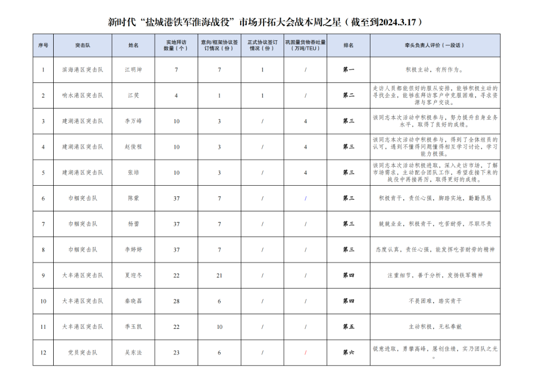 第三名:建湖港區(qū)突擊隊(duì) 李萬(wàn)峰、趙俊程、張培(拜訪(fǎng)客戶(hù)10家,簽訂意向協(xié)議3份,鞏固貨物吞吐量4萬(wàn)噸)、巾幗突擊隊(duì) 陳蒙、楊蕾、李婷婷(拜訪(fǎng)客戶(hù)37家,簽訂意向協(xié)議7份)