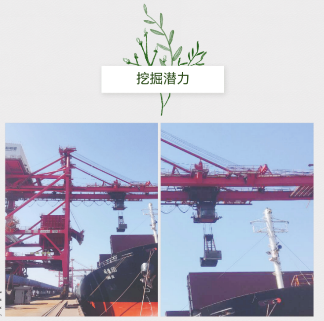 深入挖掘設(shè)備潛能,實(shí)施了一系列“賦能升級”計(jì)劃。改進(jìn)卸船機(jī)水渣抓斗工藝,從原有的14m3、21T的水渣抓斗采購16.9m3、25T的抓斗,使其在滿足額定起重量要求的同時(shí),具備煤炭備用抓斗的功能;對堆料機(jī)進(jìn)行流量升級,通過改造漏斗、支架等細(xì)節(jié),平均流量從1800T/H提升至2200T/H,在提高堆料機(jī)的穩(wěn)定性和效率的同時(shí),也降低了新設(shè)備采購的成本。