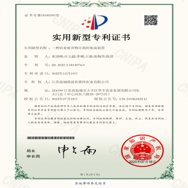 扎實(shí)推進(jìn)科研創(chuàng)新,不斷將理論研究成果轉(zhuǎn)化到實(shí)際生產(chǎn)過(guò)程與產(chǎn)品中,截至目前,鹽農(nóng)循環(huán)農(nóng)業(yè)先后取得了3個(gè)肥料登記證,獲得自主研發(fā)專利24項(xiàng)(其中發(fā)明專利4項(xiàng)),另外還有15項(xiàng)專利已受理。率先使用新型機(jī)械沼液還田機(jī),實(shí)現(xiàn)沼液在旱作物大面積推廣施用,替代70%以上化肥用量,將理論轉(zhuǎn)化為實(shí)際?!罢右涸诘钧溳喿魃鲜┯眉夹g(shù)規(guī)范”地方標(biāo)準(zhǔn)成功立項(xiàng),為沼液推廣應(yīng)用打下堅(jiān)定的基礎(chǔ)。 申報(bào)成功國(guó)家高新技術(shù)企業(yè)、江蘇省農(nóng)業(yè)科技型企業(yè)、江蘇省三星上云企業(yè)、市級(jí)農(nóng)業(yè)產(chǎn)業(yè)化龍頭企業(yè)等稱號(hào)。與揚(yáng)州大學(xué)等高校共同申報(bào)的2022年江蘇省碳達(dá)峰碳中和科技創(chuàng)新專項(xiàng)資金項(xiàng)目-沿海灘涂農(nóng)田生態(tài)碳匯能力提升模式構(gòu)建和試驗(yàn)示范基地建設(shè)也正在按進(jìn)度穩(wěn)步推進(jìn)。