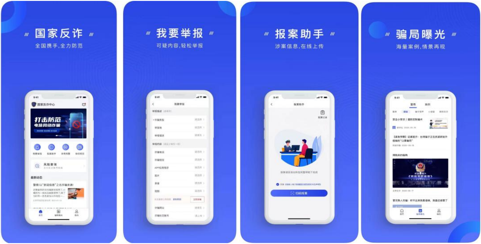 “國家反詐中心APP”是由公安部刑事偵查局提供的用于接受詐騙舉報的APP。它可以免費提供防騙保護,當(dāng)收到涉嫌詐騙的電話、短信、網(wǎng)址或安裝涉嫌詐騙的APP時,可以智能識別預(yù)警;并可以對非法可疑的電信網(wǎng)絡(luò)詐騙行為進行在線舉報,為公安機關(guān)提供更多的反詐線索,在后臺及時封殺;當(dāng)涉及陌生賬號轉(zhuǎn)賬時,可以驗證對方的賬號是否涉嫌詐騙,及時規(guī)避被騙風(fēng)險;平臺還會定期推送防詐騙文章、曝光最新詐騙案例,提高防騙意識。