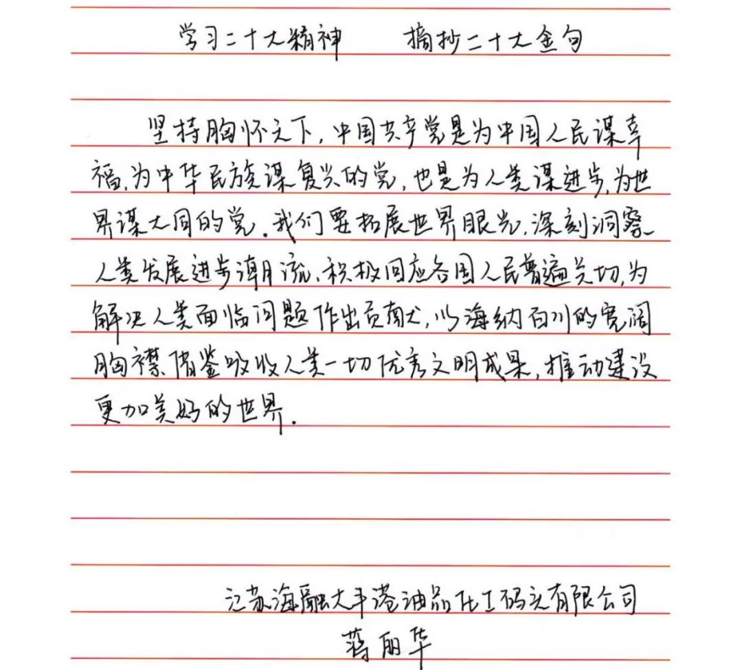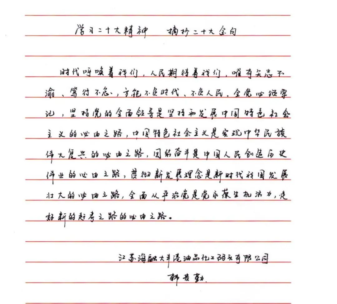 為深入學(xué)習(xí)宣傳貫徹黨的二十大精神,切實把思想和行動統(tǒng)一到黨的二十大精神上來,使黨員干部做到“學(xué)原文、悟原理、知原義”。近日,江蘇大豐港和順科技股份公司黨支部組織開展手抄黨的二十大報告“金句”活動,黨員干部積極參加、以筆抒懷,用特別的方式書寫對黨的赤誠忠心。