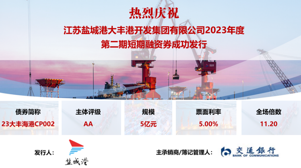6月29日,大豐港開發(fā)集團(tuán)成功發(fā)行2023年度第二期短期融資券,本期短期融資券金額5億元,發(fā)行利率5%,認(rèn)購倍數(shù)11.2倍,創(chuàng)下2023年度鹽城地區(qū)同一品種申購倍數(shù)最高紀(jì)錄,充分反映了投資機(jī)構(gòu)對鹽城港發(fā)展的高度認(rèn)可和信任,也為后續(xù)資本市場融資奠定了堅實基礎(chǔ)。