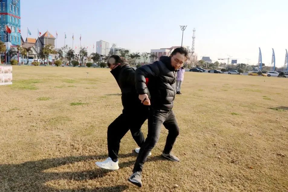 第四棒同舟共濟(三人四足),選手們互相搭著肩膀,喊著“一二、一二”整齊有序的口號奮力前行。隊友們跟隨著一起奔走,現(xiàn)場氣氛緊張而熱烈。