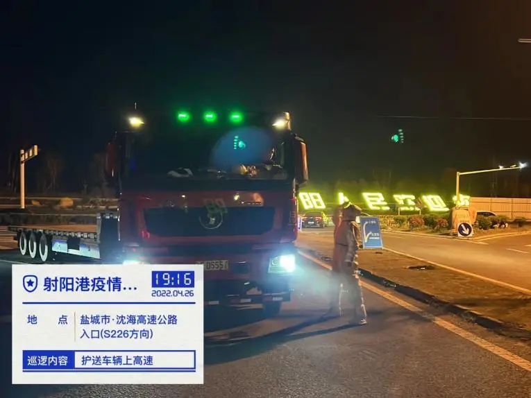 4月26日,接到客戶運(yùn)輸車輛到達(dá)射陽高速出口檢查點,請求協(xié)助的電話后,港區(qū)立刻成立專項小組穿戴好防護(hù)服至高速口開展全程配套服務(wù),及時將運(yùn)輸車輛引導(dǎo)到港區(qū)。