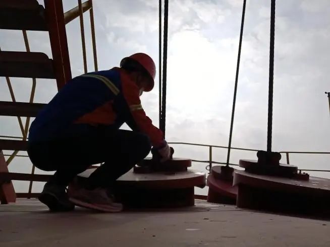 為契合“千匯018”7片118米葉片裝船,制定作業(yè)方案時(shí)已綜合考慮,其中點(diǎn)位觀測(cè)是重點(diǎn)環(huán)節(jié)也是撓頭的工作,誤差系數(shù)不能>0.05M,GPS測(cè)距儀雖然方便,但碼頭信號(hào)弱、光學(xué)量距點(diǎn)位信息混淆且誤差大。通過(guò)現(xiàn)場(chǎng)大家積極查閱相關(guān)資料,想出了“小妙招”,運(yùn)用“墊1架3側(cè)3”疊碼法,既創(chuàng)新了創(chuàng)新工藝方法,用最簡(jiǎn)單的工具發(fā)揮最大的效能;又探索出新的非標(biāo)裝船模式,滿(mǎn)足了客戶(hù)的需求。