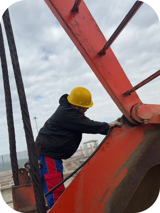 他攀至高聳門機頂端,低頭細致檢查設備,專注各部件運行健康狀況。每一次低頭,都是對設備安全的守護。
