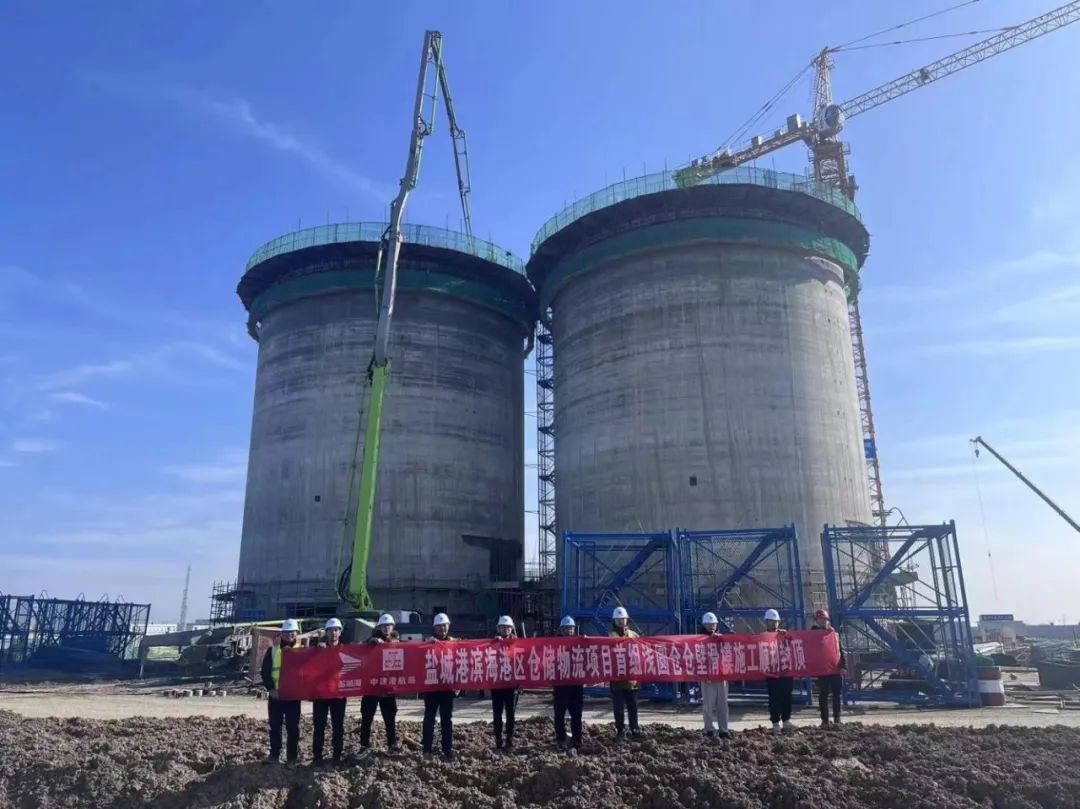 近日,濱海港區(qū)倉儲物流項目首組淺圓倉倉壁順利封頂。