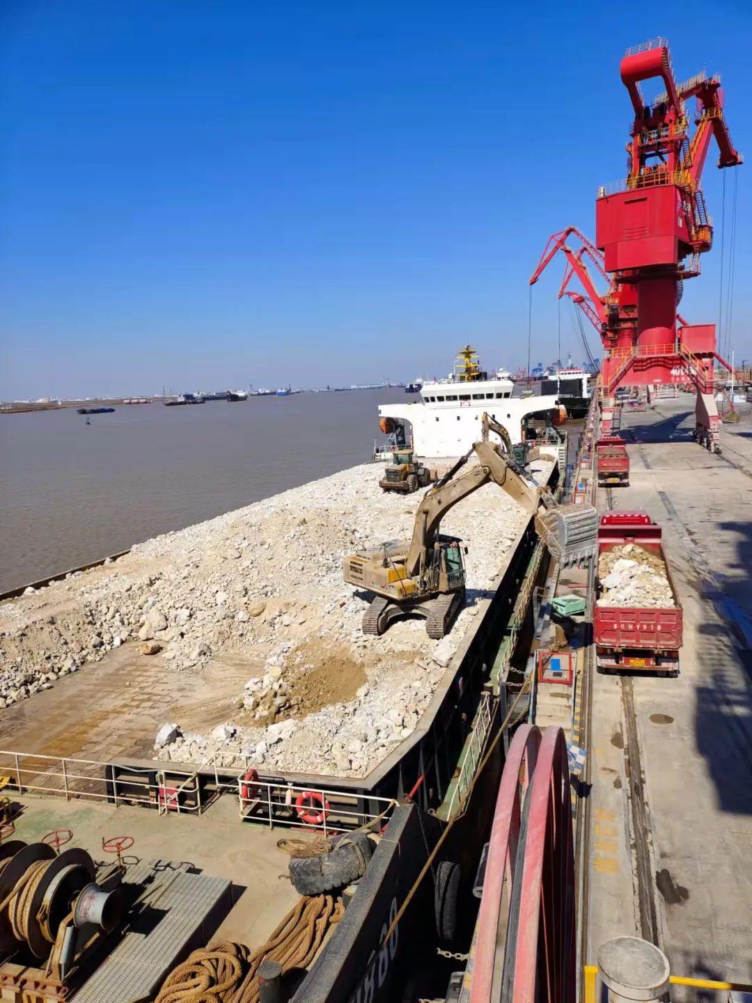 公司是樹,客戶是根,服務是本。響水港區(qū)生產團隊一如既往地重視該類大輪的生產組織,在“鴻運9888”甲板船作業(yè)過程中重點強化了相應的安全監(jiān)管,團隊提前對大輪各項參數進行詳細了解,在靠泊時避開了門機高壓電纜區(qū)域,及時在接卸區(qū)域碼頭前沿纜坑處鋪設了相應的鋼板,確保整個裝卸過程安全。由于自卸船舶吃水較淺,受灌河潮汐影響也相對較小,因此和港區(qū)其他海輪在一定程度上可以進行互補,有效提升碼頭利用率,進一步提升了港口作業(yè)及應收能力。