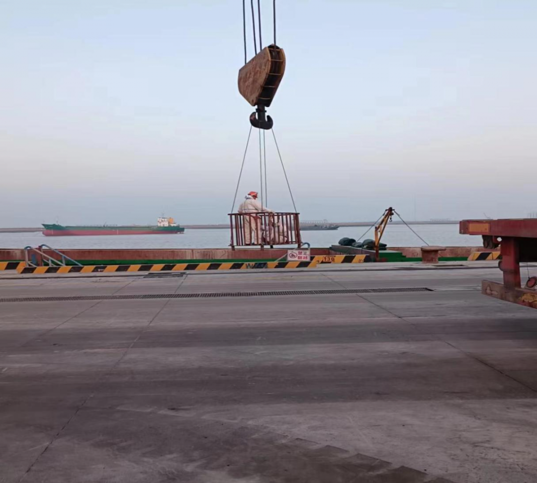 △清艙人員乘坐特殊“交通工具”下艙進(jìn)行清理工作