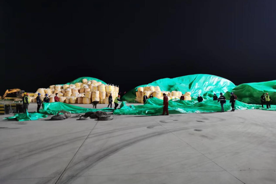 雖然該輪采用客戶自行裝卸模式,響水港區(qū)在接到客戶求助后,沒有絲毫推脫責(zé)任,本著任何一個(gè)來港客戶都是我們服務(wù)對(duì)象的工作意識(shí),迅速組織人員隊(duì)伍和物資投入到了貨物苫蓋搶險(xiǎn)中,及時(shí)從港內(nèi)物資倉庫調(diào)劑了一千多平方的防雨布,同時(shí)調(diào)集港內(nèi)近20名員工參與苫蓋搶險(xiǎn)。為確保各個(gè)環(huán)節(jié)迅速、高效,港區(qū)生產(chǎn)、市場(chǎng)等部門同志全部親臨一線溝通協(xié)調(diào),經(jīng)過近8小時(shí)的奮戰(zhàn),一直到次日凌晨2點(diǎn)左右,苫蓋基本結(jié)束,客戶懸著的心終于落地,并對(duì)港區(qū)的服務(wù)再三表示感謝??紤]到夜間視線不清等因素,27日天亮后,生產(chǎn)部門管理人員再次對(duì)碼頭苫蓋質(zhì)量進(jìn)行了檢查,對(duì)靠海側(cè)安排人員進(jìn)行了再加固,確保了碼頭所有貨物不被雨水淋濕。