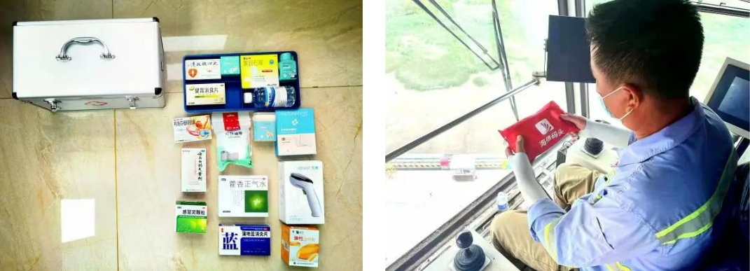 響水港區(qū)貼心地在門機操作區(qū)、碼頭休息區(qū)、辦公區(qū)都準備了應急藥箱。藥箱雖小,“五臟俱全”。內含體溫計、感冒沖劑、急救類常用藥品及醫(yī)用紗布、碘酊等常備創(chuàng)傷性醫(yī)療應急物品。點滴之處見真功,細微之中見真情。小小藥箱把對員工的關愛落實到實處,讓員工切身感受到了集團的呵護與關愛。