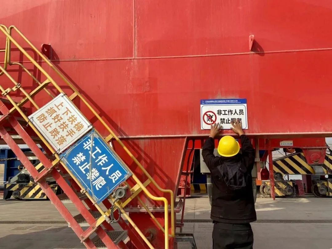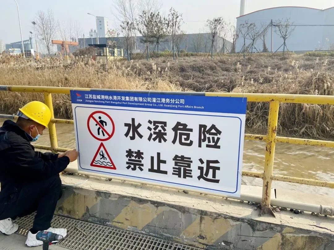 在港區(qū)門閘處設(shè)置“非作業(yè)車輛、工作人員禁止入內(nèi)”標(biāo)識,提示社會人員、車輛不要誤闖誤入港區(qū)。在引橋欄桿上懸掛“注意路口,當(dāng)心貨車”“禁止酒后上崗,必須戴安全帽”等標(biāo)識,提醒工作人員注意自身安全,嚴(yán)肅上崗紀(jì)律;在碼頭后沿護(hù)欄上懸掛“禁止翻越”“水深危險,禁止靠近”,警示工作人員不要翻越碼頭護(hù)欄,遠(yuǎn)離危險水域。本次完善新增警示標(biāo)識牌共十余塊。