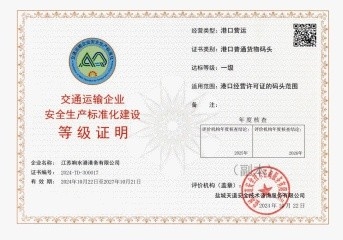 近日,鹽城港響水港區(qū)順利通過交通運輸企業(yè)安全生產標準化達標認證考核,喜獲“交通運輸企業(yè)安全生產標準化建設一級證書”。響水港區(qū)在安全生產管理體系精細化、規(guī)范化、標準化建設方面邁入新的發(fā)展階段,為推動港口安全生產工作再上新臺階奠定了堅實基礎。