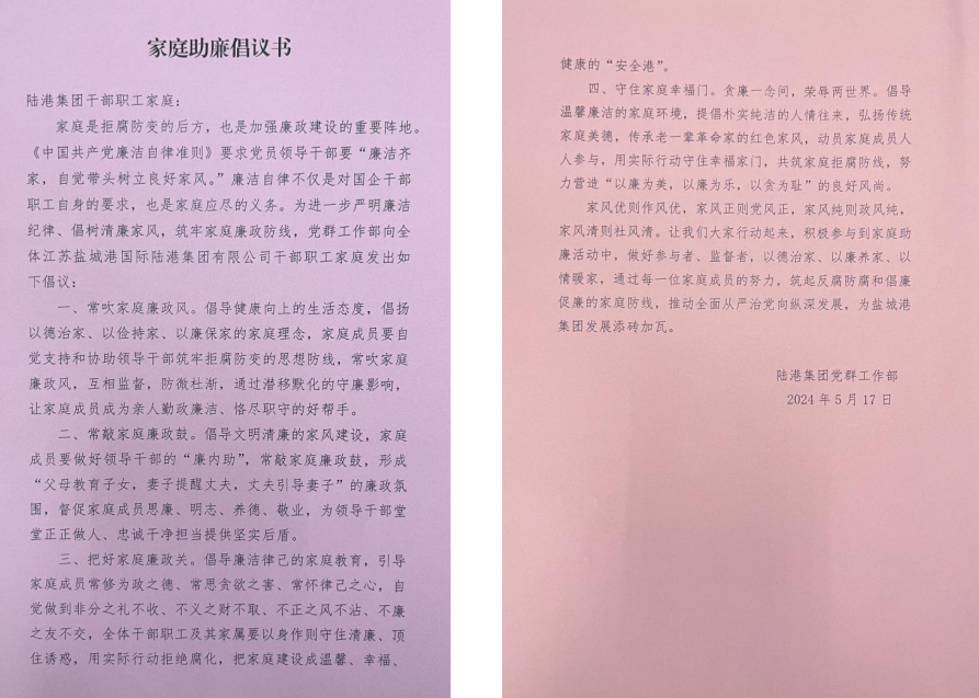 家庭齊心助廉?!盀檫M一步嚴明廉潔紀律、筑牢家庭廉政防線,黨群工作部向全體陸港集團干部職工家庭發(fā)出如下倡議……”在警示教育大會上,陸港集團黨群工作部向全體干部職工發(fā)出了《家庭助廉倡議書》,引導干部職工家屬常吹“家庭廉潔風”,做好“家庭廉內助”,把好“家庭廉潔門”,以清廉家風抵御腐敗歪風,齊心協(xié)力,共同織密“家庭護廉網”。