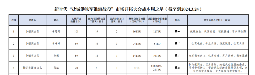 為確保新時代“鹽城港鐵軍淮海戰(zhàn)役”市場開拓大會戰(zhàn)取得實效,航運集團突擊隊和巾幗突擊隊堅持“早晨會、晚匯報”工作機制,全面梳理腹地市場,明確目標客戶群體,制定詳細的市場開拓計劃。同時,強化攬貨人員培訓,以“戰(zhàn)功第一、全力以赴,令行禁止、使命必達”的要求,按照“我說你聽、你說我聽,我做你看、你做我看”老帶新模式,通過發(fā)放“流動紅旗”并將“奔?!薄拔伵!痹诋斣驴冃е杏枰泽w現(xiàn)的方式,“比學趕超,樹立典型”,進一步發(fā)揮榜樣力量,不斷提升服務水平,以“軟實力”助推“硬發(fā)展”。
