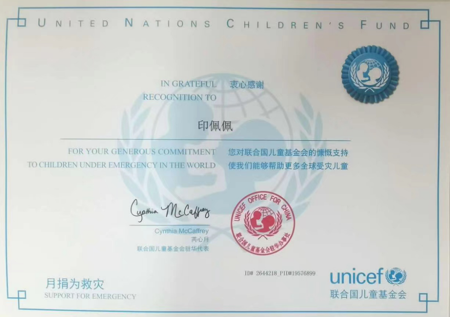 近年來,有越來越多的愛心單位、社會組織和義工、志愿者不斷參與關愛兒童行動,讓孩子可以在愛的陽光下健康快樂成長。今天,鹽城港港口公司“海燕”班組成員印佩佩同志收到了來自聯(lián)合國兒童基金會的捐獻證書。自去年加入“海燕”班組以來,印佩佩堅持每月向聯(lián)合國兒童基金會捐款,用最簡單、最直接的方式關注兒童、支持兒童、幫助兒童,為祖國花朵捐出一份愛心、奉獻一片真情。