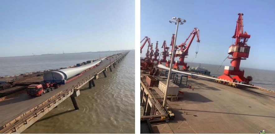 近日,在鹽城港大豐港區(qū)通用碼頭2#泊位上演了一場(chǎng)風(fēng)電葉片的吊裝大片。兩套116米巨龍般的風(fēng)電葉片,隨著吊裝繩索穩(wěn)穩(wěn)吊放在“盛達(dá)98”輪甲板上,標(biāo)志著本次風(fēng)電葉片作業(yè)任務(wù)順利完成,起航運(yùn)往廣西防城港。