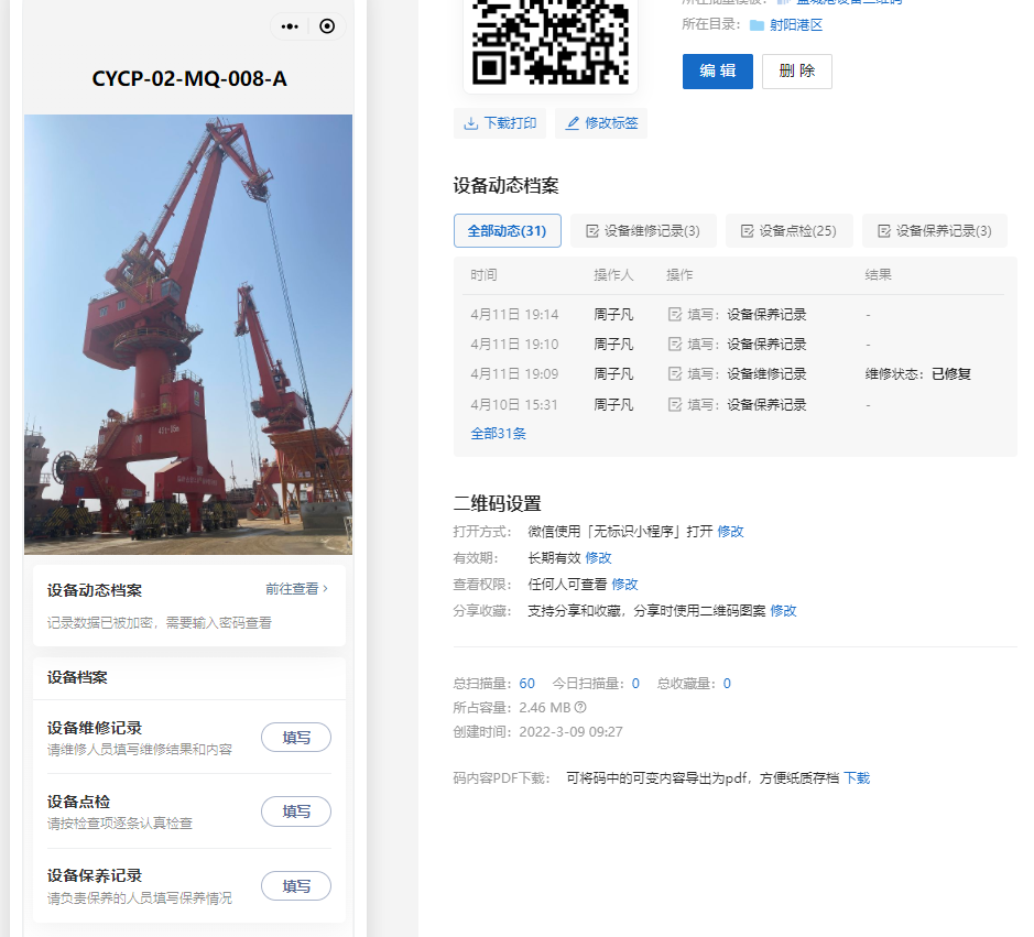 現(xiàn)場(chǎng)維護(hù)保養(yǎng)人員通過(guò)掃描港口設(shè)備上的二維碼,即可將設(shè)備維修、點(diǎn)檢和保養(yǎng)記錄錄入設(shè)備二維碼中,后臺(tái)數(shù)據(jù)實(shí)時(shí)更新,管理人員可隨時(shí)隨地查看全集團(tuán)港口設(shè)備的運(yùn)行情況,實(shí)現(xiàn)集團(tuán)集中掌握全部港口設(shè)備的運(yùn)行狀態(tài),提升了設(shè)備管理效率,對(duì)出現(xiàn)的問(wèn)題能夠及時(shí)解決。同時(shí),利用大數(shù)據(jù)匯總分析設(shè)備的整體狀態(tài),可以對(duì)設(shè)備后期的采購(gòu)、維護(hù)保養(yǎng)提供一定建議。
