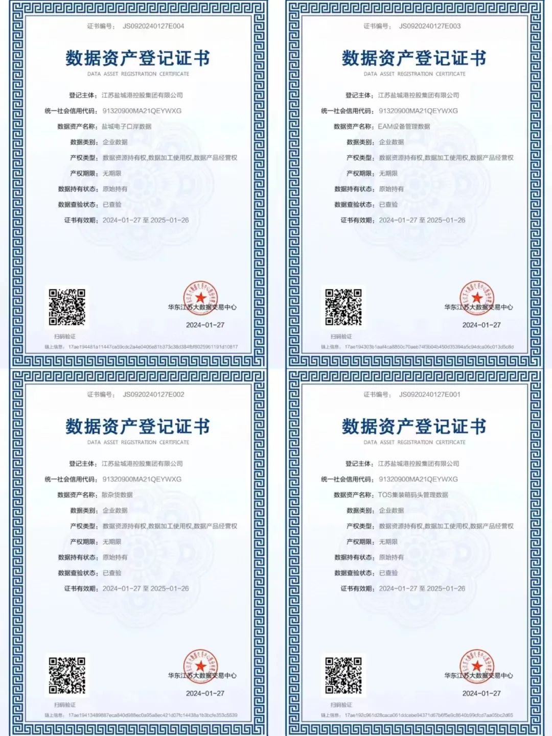日前,鹽城港集團順利完成集裝箱碼頭生產(chǎn)操作系統(tǒng)(TOS)、電子口岸系統(tǒng)、港機設(shè)備物資管理系統(tǒng)(EAM)、散雜貨生產(chǎn)管理系統(tǒng)(MES)數(shù)據(jù)資產(chǎn)質(zhì)量評價及價值評估,并獲得《數(shù)據(jù)資產(chǎn)登記證書》,成為鹽城市首批完成數(shù)據(jù)資產(chǎn)登記的企業(yè)之一,也是全國首個港口企業(yè)數(shù)據(jù)資源入表案例。