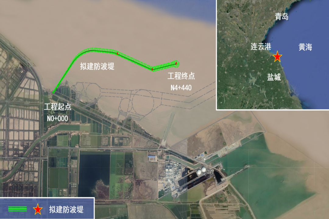 鹽城港濱海港區(qū)北港池防波堤一期工程位于濱海港區(qū)規(guī)劃北港池水域,防波堤與既有防潮大堤相接,接岸點位于蝦須港閘東側(cè)約1km處。工程全長4440m,分為陸上施工和海上施工兩個部分。