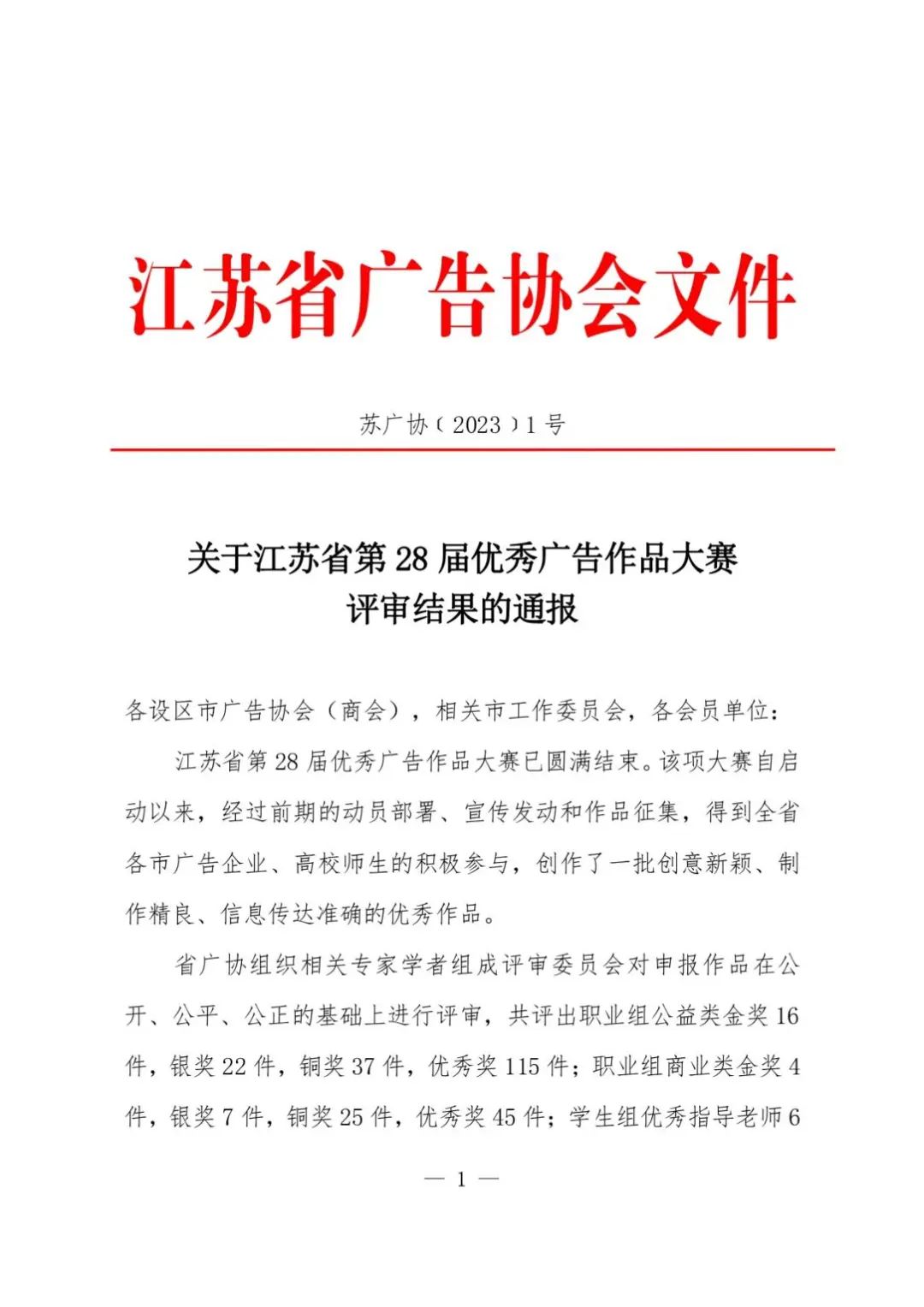 據(jù)悉,“江蘇省優(yōu)秀廣告作品大賽”由江蘇省廣告協(xié)會主辦,迄今為止已舉辦28屆,吸引了省內數(shù)百家公司參與,每屆賽事均有數(shù)千個作品參加比賽。本屆大賽,文旅集團廣告?zhèn)髅椒止緫{借過硬的專業(yè)實力榮獲職業(yè)組公益類作品銅獎和職業(yè)組公益類作品優(yōu)秀獎。