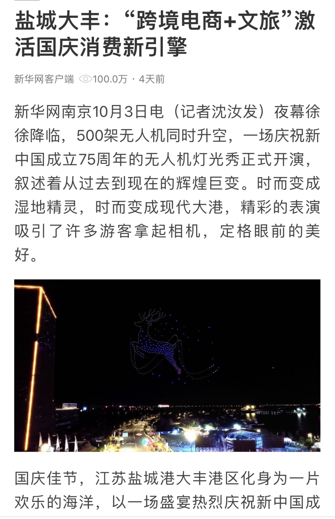 音樂盛宴、“跨境電商+文旅”、無人機表演……為期七天的國慶黃金周火爆落幕,鹽城港以其獨特的魅力吸引了無數(shù)游客的目光,文旅產(chǎn)業(yè)持續(xù)升溫,游客消費熱情高漲,傳遞著假日經(jīng)濟的強勁“脈動”。