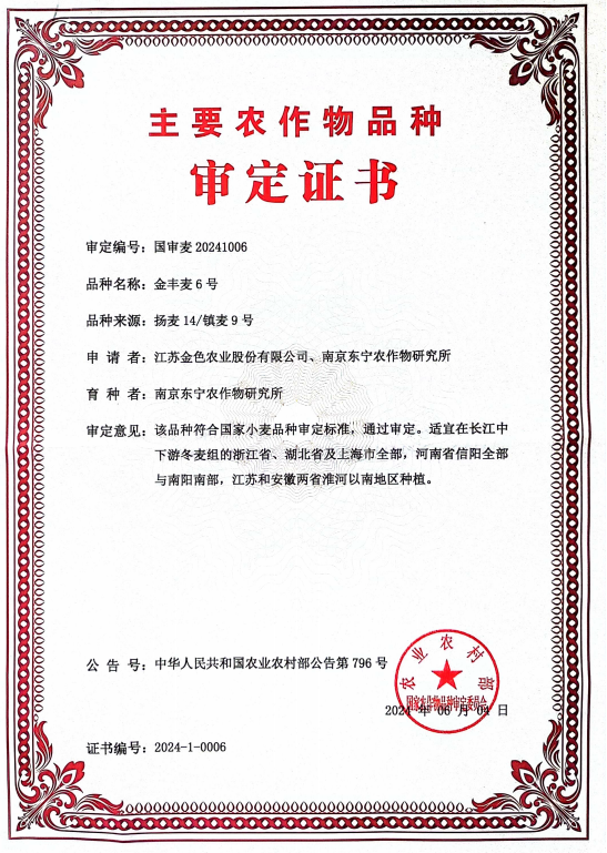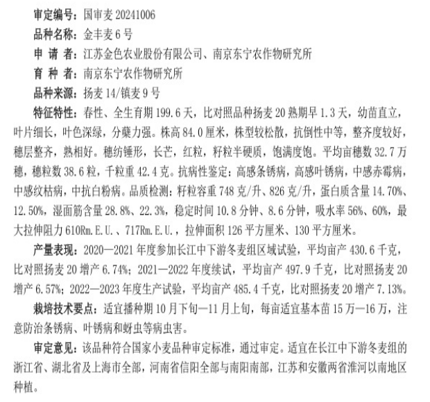 近日,農(nóng)業(yè)農(nóng)村部發(fā)布第五屆國家農(nóng)作物品種審定委員會第四次主任委員會會議審定通過的作物品種,農(nóng)業(yè)科技集團(tuán)所屬金色農(nóng)業(yè)選育的小麥新品種“金豐麥6號”通過國家審定。