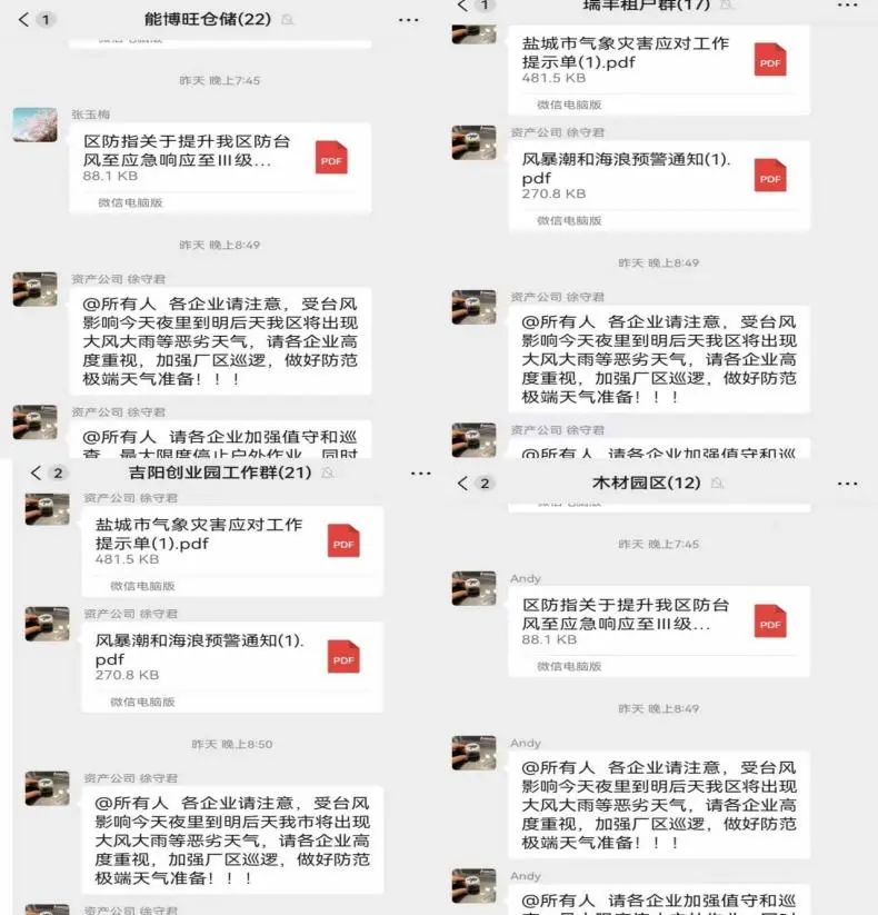 廣宣傳 強(qiáng)提醒。公司安全環(huán)保部密切關(guān)注臺風(fēng)動(dòng)向,加強(qiáng)預(yù)警預(yù)報(bào),第一時(shí)間通過工作群轉(zhuǎn)發(fā)《鹽城市氣象災(zāi)害應(yīng)核對工作提示單》及各類預(yù)警信息,通過層層宣傳,擴(kuò)大臺風(fēng)預(yù)警范圍,一方面提示小區(qū)居民做好戶外物品收回、非必要不出門等安全防范工作;另一方面提高承租戶應(yīng)對防御臺風(fēng)的重視程度。