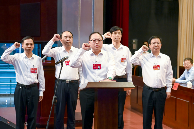 在全體代表的監(jiān)誓下,新當(dāng)選的市長和市人大常委會委員進行了莊嚴(yán)的憲法宣誓。